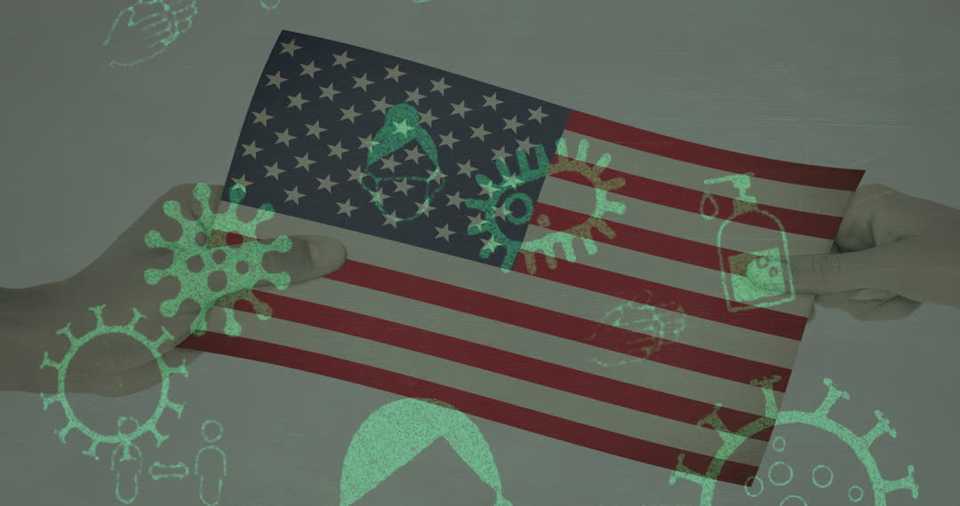 Illustration features the USA flag with transparent COVID-19 icons floating, symbolizing the global struggle with the pandemic in the American context. Useful for articles or presentations on the pandemic impact in the United States, health education materials, or as part of a visual campaign raising awareness on COVID-19.