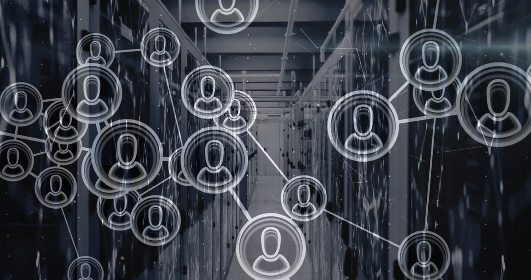 Digital representations of silhouetted user icons connected by lines overlay modern server room background. Useful for illustrating contemporary technology themes such as cloud computing, digital transformation, data security, and connectivity. Ideal for presentations or articles covering internet infrastructure, data handling, and IT management.