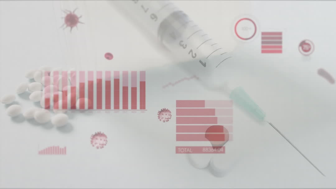 Digital depiction integrates COVID-19 cells, vaccination syringe, and analytical data graphics. Visual emphasizes scientific efforts to understand and mitigate pandemic impact through vaccinations and data-driven research. Useful for articles on vaccine development, healthcare advancements, COVID-19 informational content, science and technology infographics.