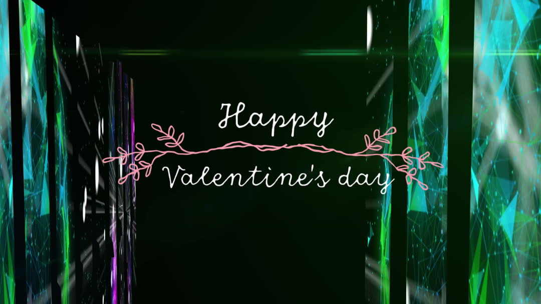 Futuristic digital network design offers colorful, abstract background featuring "Happy Valentine's Day" text. Great for romantic greetings and high-tech themed holiday presentations. Ideal for use in social media graphics, e-cards, or tech-focused commercial projects to blend romance with modern technology.