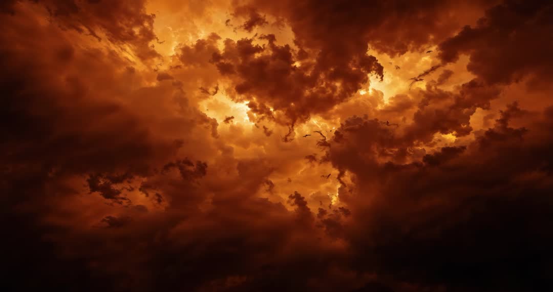 AI Generated Image. Dramatic time-lapse showcasing storm evolution as clouds intensely shift colors creating an atmospheric and ominous scene, capturing the flashing intensity and power above valleys. Perfect for storytelling in weather forecasts and powerful visuals in fantasy film projects to evoke emotion and tension or showcase natural phenomena.
