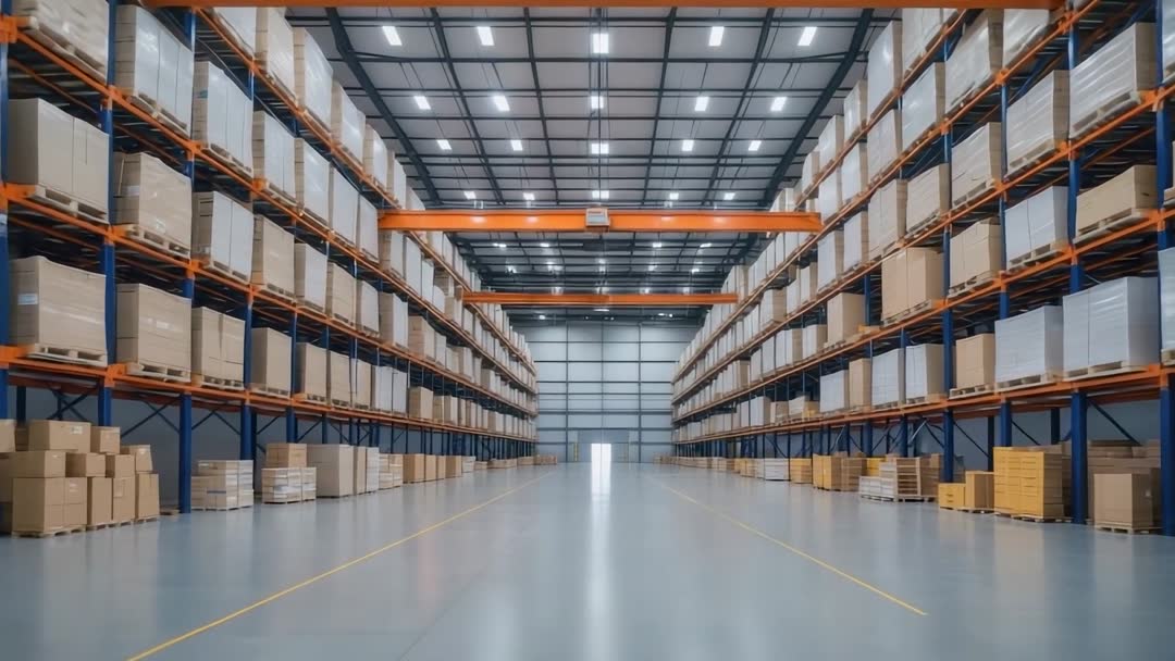 - Vast Modern Warehouse Interior with Storage Racks and Pallets