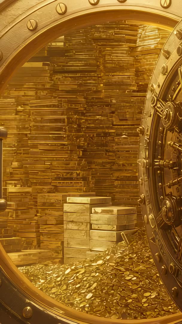 AI Generated Video. Showing large circular vault door swinging open to expose towering stacks of gold bars and sprawling pile of coins bathed in warm amber lighting. Framing from doorway in vertical orientation, close-up on wheel mechanism and rim while slow inward camera movement revealing pallets of bullion and neatly stacked ingots. Casting rich golden reflections across metal surfaces, creating cinematic luxury atmosphere and heavy sense of value. Serving well for finance and banking videos, investment and wealth management promos, cryptocurrency campaigns, security and insurance explainers, TV and film heist sequences, and editorial coverage of precious metals markets. Suggesting use with dramatic music, slow zoom or parallax motion, headline overlays and lower thirds for vertical social ads and mobile reels. Recommending color grade with warm highlights, subtle vignetting to emphasize depth, and looping for background use in corporate presentations or advertising.