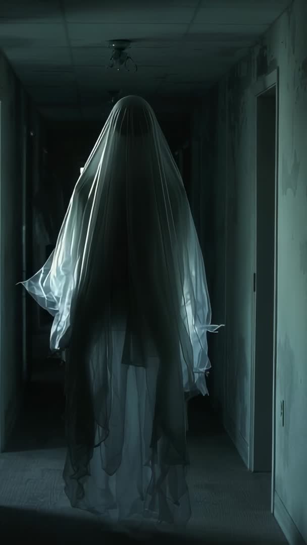 AI Generated Image. Featuring veiled figure drifting down dim corridor with overhead light flickering, vertical video conveying chilling, suspenseful mood. Composing tall narrow frame around central silhouette, translucent veil creating layered textures and soft highlights. Using moody teal-green toning and deep shadows to evoke supernatural atmosphere. Serving well for Halloween trailers, horror reels, TikTok and Instagram Reels, haunted attraction promos, paranormal documentary openers, suspenseful title sequences, podcast background visuals, cinematic short films. Pairing with low-frequency drone, distant whispers, slow rising sting, and subtle camera push-in to intensify tension. Recommending color grading toward teal or desaturated palette, adding film grain and VHS glitch overlays for retro horror vibe. Allowing overlay of vertical captions or countdown graphics in upper and lower negative space for social format marketing.