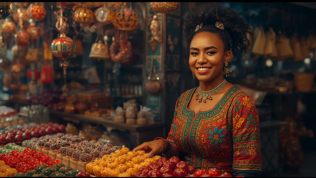 AI Generated Image. A vendor in crafted attire focused on arranging an array of colorful traditional sweets at a bustling bazaar. The scene comes alive with vibrant lanterns and intricate decorations that set an inviting atmosphere. This image captures the cultural richness and artisanal spirit of traditional markets, portraying meticulous preparation for arriving customers. Ideal for use in cultural content, market scenes, and retail-focused media.