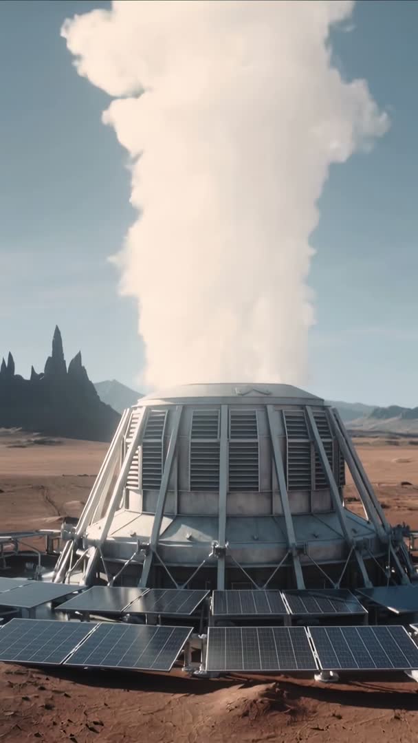 AI Generated Image. Vertical clip showing metallic industrial dome venting towering steam plume over red arid plain, solar panels forming low-profile array in foreground and jagged mesas on horizon. Footage featuring blend of geothermal-style venting and solar power infrastructure, conveying clean energy production, technological resilience, and remote operations. Composition offering strong vertical axis for mobile platforms (9:16), cinematic lighting, and warm desert tones. Suitable for documentary segments on renewable energy, corporate sustainability promos, sci-fi intros, educational explainers on hybrid power systems, news packages about energy technology, and vertical social media reels or ads. Editing suggestions: add subtle ambient pads and low-frequency rumble for mechanical weight, color grade toward warm ochre and cool metal contrast, overlay animated graphics to illustrate energy flow. License-friendly clip for stock libraries, editorial use, and motion design projects needing futuristic industrial visuals.
