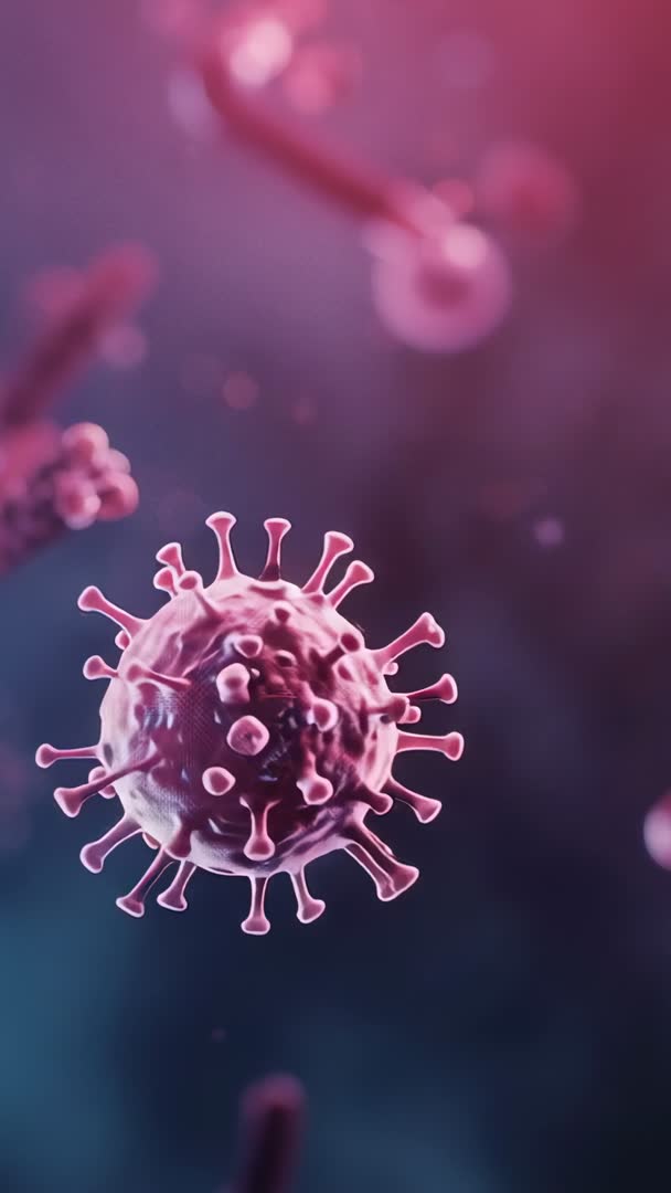 AI Generated Image. Vertical 3D microscopic animation zooming inward toward single virion suspended in plasma, revealing spike proteins, membrane texture, and nearby rod-like particles with cinematic bokeh. Featuring magenta and teal color grade, translucent surface detail, and shallow depth of field for dramatic biomedical visualization. Designed for vertical platforms and mobile-first workflows, matching 9:16 aspect ratio and full-motion clip requirements. Serving uses such as science explainers, news segments, medical presentations, educational modules, social media stories, and public health campaigns focused on virology or vaccine research. Working well as opening sequence, background for voiceover, animated thumbnail, or visual accent in documentary and corporate health reports. Supplying high-impact visual for simplifying complex concepts and attracting viewer attention on vertical feeds.