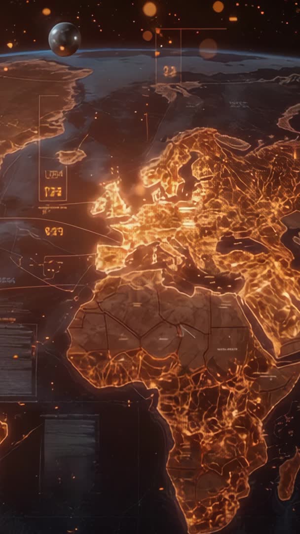 AI Generated Image. Vertical video showing 3D holographic map of Europe and Africa, glowing with molten-orange circuitry and animated data overlays. Floating panels and HUD elements updating metrics, coordinates, and network lines while planet curvature and satellite object orbiting in background. Scene featuring high-contrast neon glow, subtle particle effects, and dynamic camera movement ideal for vertical-format playback. Useful for tech promos, cybersecurity presentations, broadcast openers, corporate reports, app intros, futuristic trailers, social media vertical ads, and event visuals. Editing suggestions: looping clip for seamless background, color grading to match brand palette, overlaying logo and lower thirds, adjusting speed for dramatic reveal, and isolating HUD layers for custom data integration.