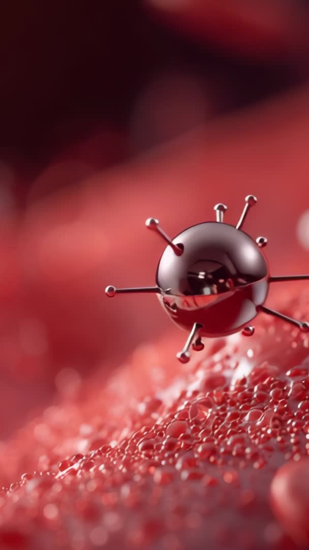 AI Generated Image. Vertical short loop showing reflective spiked metallic sphere rotating and drifting right across porous red bead surface. Shallow depth of field creating soft bokeh and dramatic highlights on glossy metal. Minimal composition offering generous copy space for overlaying headlines, logos, lower thirds. Futuristic, clinical and luxurious mood suitable for tech, design and science themes. Working well for social media reels, app intros, product promos, motion graphic openers and advertising backgrounds. Loopable clip offering easy integration into vertical mobile campaigns; recommended edits include slow zoom, subtle color grading, typographic overlays and atmospheric sound design.