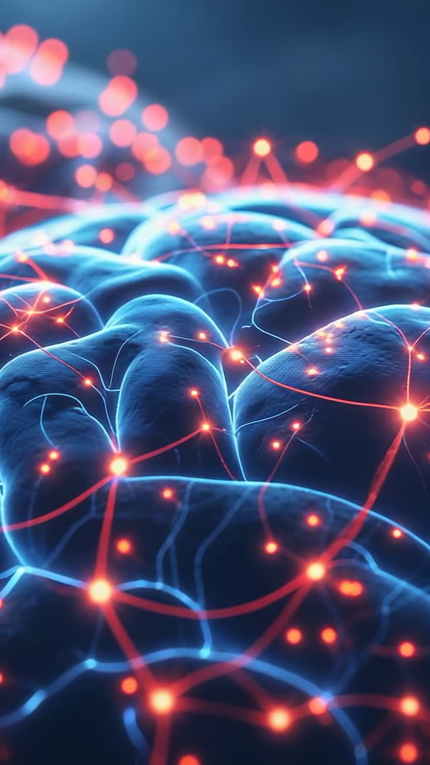 AI Generated Image. Vertical 3D neural network video depicting sparking pulses racing across cortical surface with glowing blue filaments and red node highlights. Close-up motion showing interconnected neural pathways and synapse-like nodes pulsing with light and flowing data, evoking neural activity and digital connectivity. Ideal for tech presentations, neuroscience documentaries, medical animations, AI and machine learning promotions, app intros, social vertical ads, and educational clips. Supporting seamless loop editing and color grading, delivering high-impact background for explaining connectivity, signal transmission, brain simulation, network topology, or data visualization. Offering cinematic depth, shallow focus, and vibrant color contrast for dramatic emphasis and modern futuristic look.