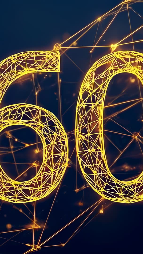 AI Generated Video. Vertical seamless video clip showing glowing golden wireframe forming numeral 60 amid sparking network nodes on deep navy background. Serving as dynamic anniversary opener for corporate milestone, product launch, awards ceremony, social media Reel, TikTok ad, or event countdown. Golden lines and particle sparks creating modern tech feel, offering clean space for bold headline and logo overlay at top or bottom safe area. Looping length suggestion: 6 to 12 seconds for short-form social or 20 to 30 seconds for event opener. Sound design suggestion: ambient electronic pad with soft riser and light percussive clicks to match particle motion. Editing tips: using smooth crossfade, slowing zoom-in at 5% over clip, color grading highlights toward warm gold, adding subtle glow bloom for extra luminance. Deliverables: vertical 9:16 MP4, loopable render, high-resolution PNG still for poster or thumbnail.