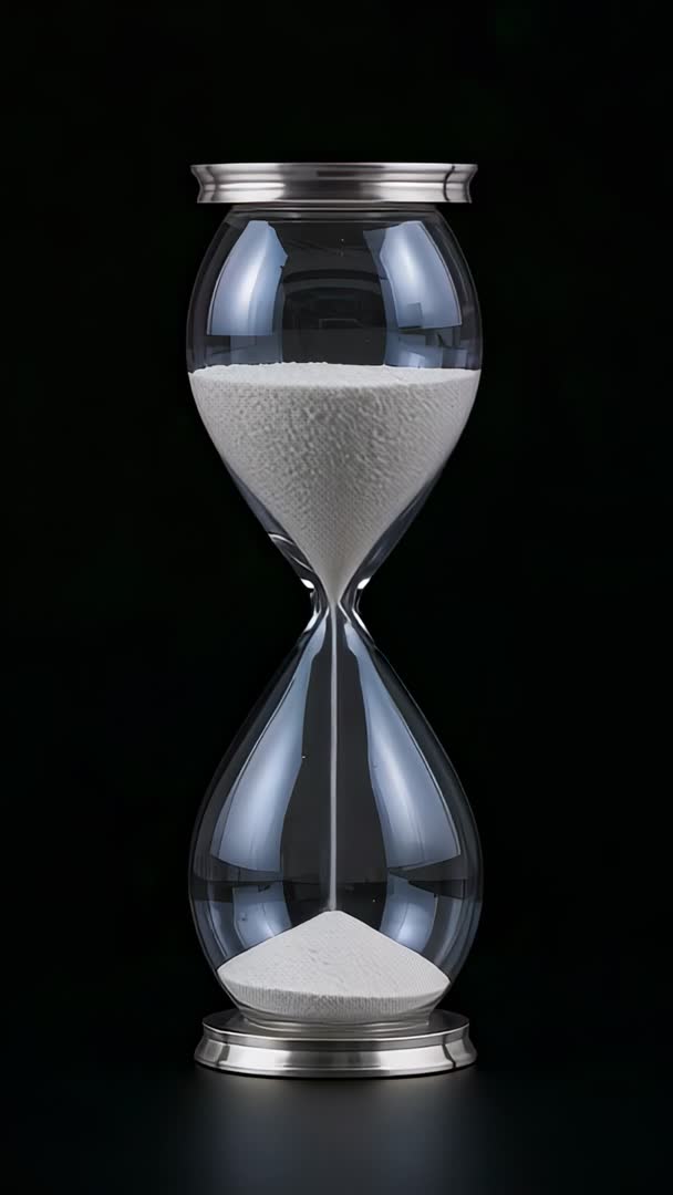 AI Generated Image. Showing vertical 9:16 hourglass with white sand flowing through narrow waist against deep black background. Featuring clear glass bulbs, brushed metal bases, and high-gloss studio reflections for polished minimalist look. Capturing smooth, steady flow of sand that conveys passing time, urgency, patience, and deadline tension. Offering vertical 9:16 frame suitable for social shorts, Reels, TikTok, Instagram Story, or mobile-first ad creative. Working well as countdown clip, intro or outro element, background B-roll, or loopable visual for presentations on time management, productivity, mindfulness, or corporate messaging. Providing clean negative space for overlay text, logo placement, or motion graphics integration.