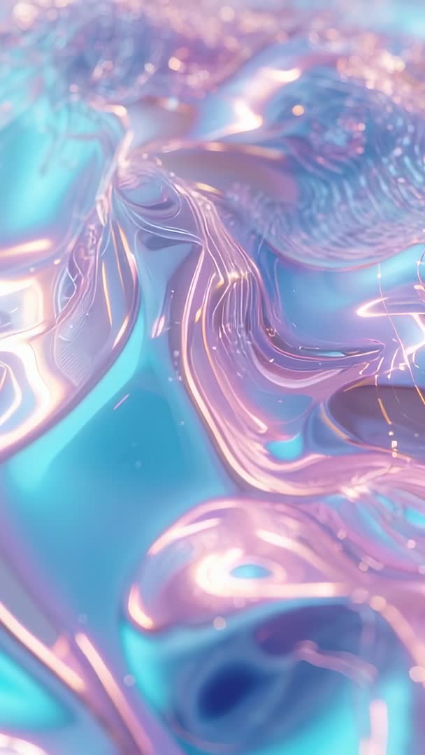 AI Generated Image. Close-up vertical 9:16 loop showing iridescent liquid surface flowing with glossy reflections and pastel color shifts. Visual mood conveying dreamy, futuristic aesthetics and tactile shimmer. Useful for mobile wallpaper, social media reels and stories, app intro screens, UI backgrounds, product showcase backdrops, fashion and beauty campaign motion backgrounds, music video overlays, event projection visuals. Designers and creators using clip for branding animations, promotional teasers, website hero loops, and ambient projection mapping. Looping motion providing seamless playback for long-form presentations and live visuals. Colour palette pairing well with pastel pinks, purples and aqua for gentle, modern look.