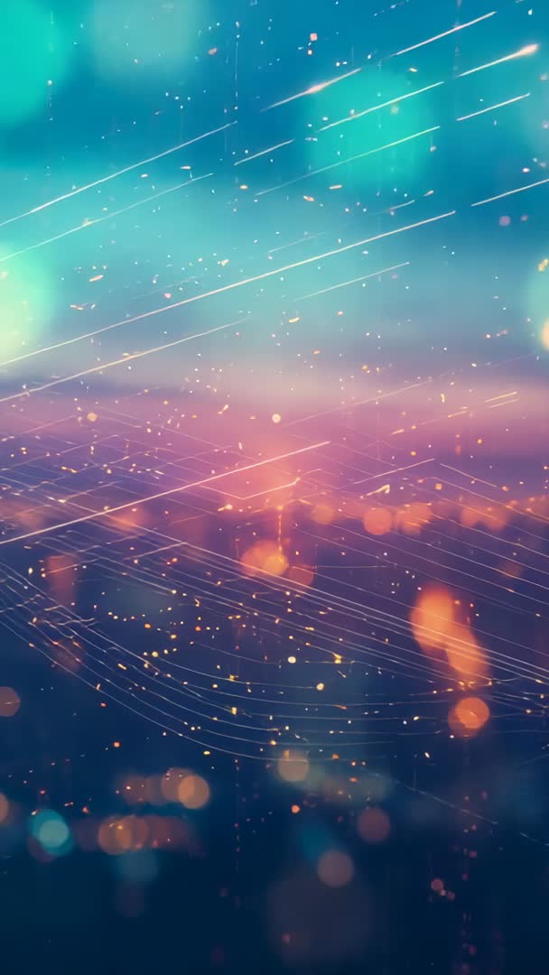 - Vertical abstract bokeh video drifting over city dusk with diagonal light streaks and warm sparks