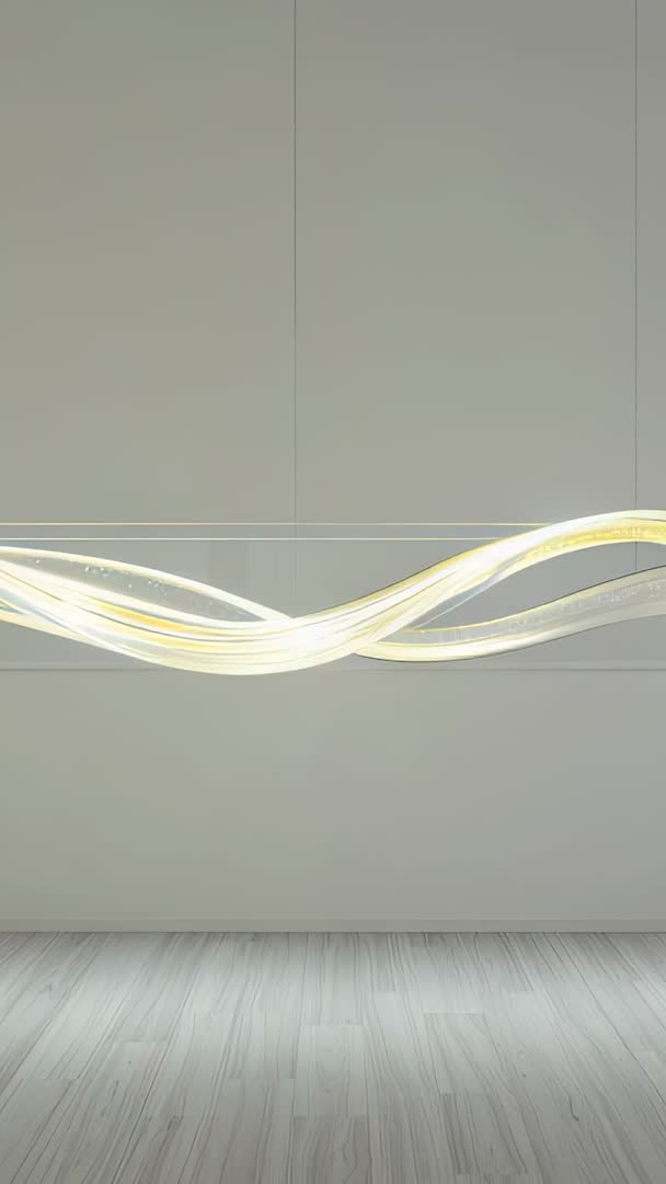 AI Generated Image. Video presenting vertical abstract glowing ribbon wave moving across minimalist panel wall with subtle floor reflection. Ribbon is shifting hues between warm gold and cool white, creating soft luminous gradient and elegant motion. Use as looping background for social media stories, mobile ads, app promos, event backdrops, digital signage, and website hero sections. Pair with bold text overlays, logo reveal animations, product showcase clips, or ambient gallery projection to add modern, high-end visual interest.