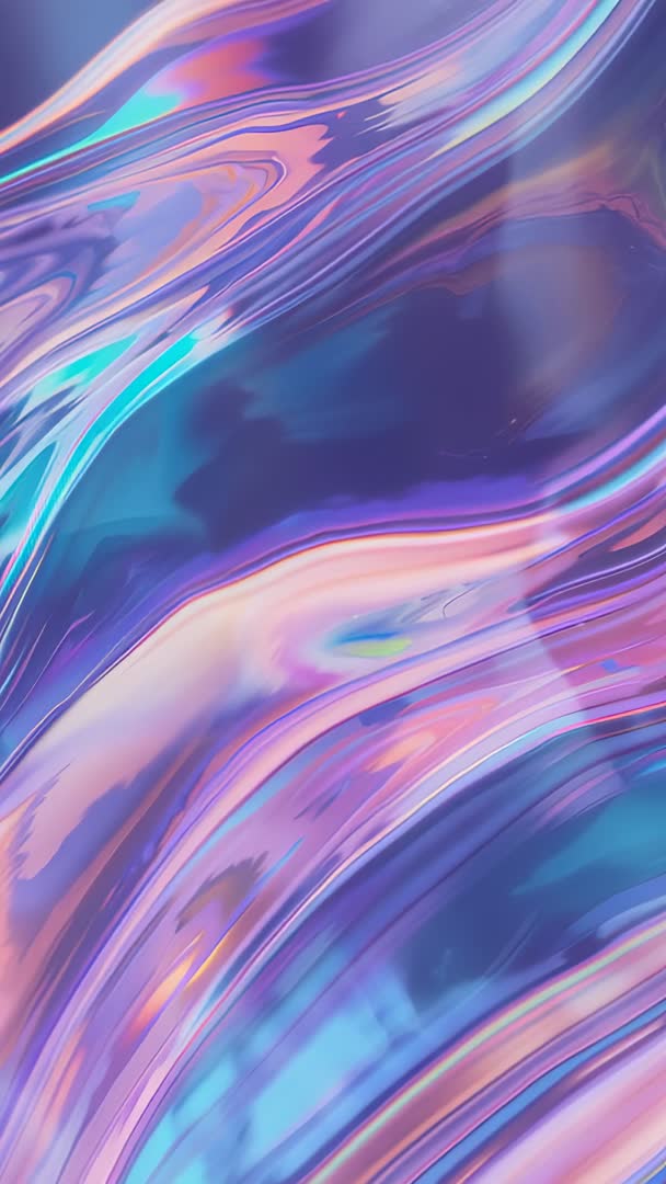 AI Generated Image. Flowing iridescent swirls blending purple, teal, peach tones into smooth liquid gradients, creating hypnotic vertical motion loop for mobile screens and social story formats. Enhancing brand content, music visuals, product promos, event projection, and app backgrounds with glossy holographic texture. Serving as seamless loop for reels, TikTok, Instagram stories, digital signage, and video transitions. Providing high-contrast highlights for overlaying text, logos, or call-to-action elements. Recommending export formats MP4 H.264 or ProRes and loop length optimization for 5-15 second repeats. Pairing tips: using minimal typography, soft white or gold accents, slow ambient music, subtle particle overlays. Targeting projects in fashion, beauty, technology, wellness, and electronic music campaigns.
