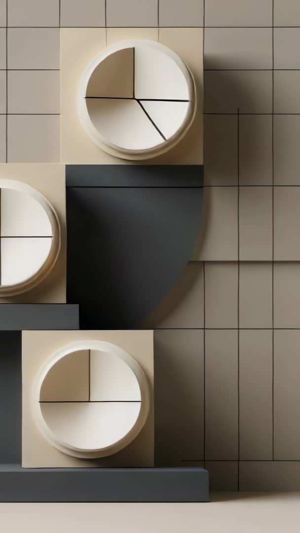 AI Generated Image. Vertical loop showing three stacked blocks rotating and sliding to reveal circular voids aligned on tiled grid plane. Neutral beige and charcoal gray palette creating minimalist sculptural composition with soft shadows and layered depth. Clean geometric choreography offering calm modern aesthetic and ample negative space for text overlays. Recommending use as looped background behind logo or headline, transition clip between scenes, mood-setting opener for design channels, or vertical ad asset for social media reels and stories. Providing seamless loop potential and portrait 9:16 format readiness for mobile platforms, suitable for architecture presentations, gallery displays, product reveals, and brand motion identity.