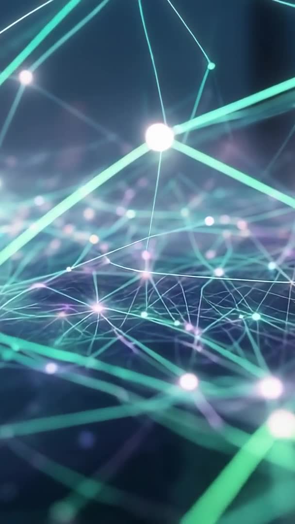 AI Generated Image. Vertical 9:16 animation showing camera drifting through layered 3D grid, pulsing nodes orbiting central hub. Neon teal and violet palette creating futuristic tech mood with shallow depth-of-field and soft bokeh highlights. Ideal for mobile app intros, tech conference openers, startup pitch decks, website hero sections, social media ads, explainer sequences covering connectivity, AI, big data, blockchain. Serving as loopable background for title overlays, lower-thirds, product demos, onboarding screens. Support for color grading, speed ramping, and simple text animations allowing easy branding and custom pacing.
