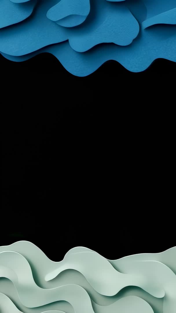 AI Generated Image. Vertical loopable abstract video showing layered paper-cut waves in blue top and mint bottom surrounding central black space. Smooth organic layers creating depth and contrast while negative space providing room for text, logos, motion elements. Serving as background for mobile story, social media vertical ad, app splash screen, event teaser, product reveal. Working well for title card, lower third, promotional overlay, or hero banner. Color palette pairing easily with white or bright accent graphics. Looping seamlessly for continuous background or editing for short form content and quick transitions. Delivering modern minimalist vibe for branding, design presentations, and cinematic social campaigns.