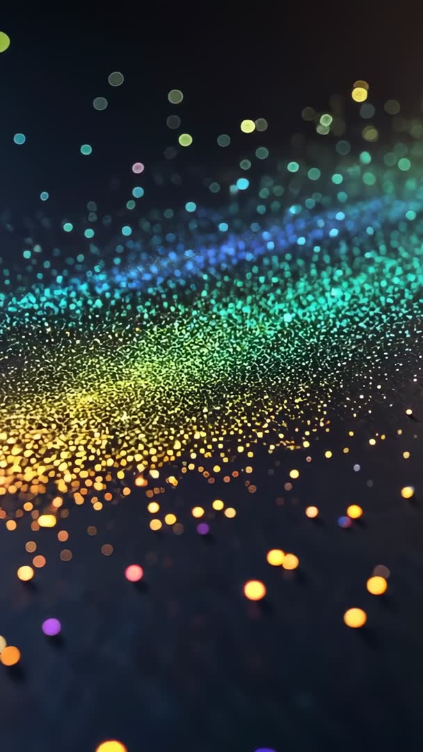 - Vertical abstract video showcasing glowing rainbow particles drifting across dark surface