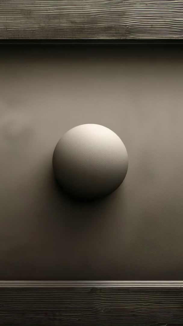 AI Generated Video. Vertical abstract video showing camera smoothly zooming from top and bottom grooved wood strips toward central convex dome on matte textured panel. Soft directional lighting creating gentle gradient and deep shadowing around dome, highlighting spherical form and fine surface texture. Neutral monochrome palette reinforcing minimal geometric composition and strong perspective. Suggesting use for background in motion design projects, branding reels, modern architecture videos, product reveal backdrops, vertical social ads, minimal design portfolios, interior design mood boards, texture and lighting studies, or stock motion for commercial edits. Pairing with typographic overlays, slow cinematic music, parallax text transitions, or subtle color grading to enhance dramatic focus on form and shadow.