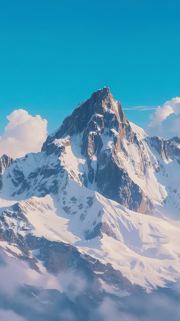 AI Generated Image. Starting dolly revealing jagged snowy alpine peak rising above low clouds. Camera moving vertically while unveiling sharp ridgelines and steep rock faces under vibrant blue sky. Lighting offering warm sun highlights on crags and cool shadows across snowfields for dramatic depth. Working well as establishing shot for adventure films, travel promos, mountain documentaries, outdoor gear commercials, tourism campaigns, social media vertical ads, and mobile wallpapers. Technical suggestions: keep slow dolly speed for cinematic reveal, capture at 24–60fps for smooth motion, color grade toward cool tones with subtle warm highlights, add ambient wind and soft orchestral score for mood. Leave safe vertical zones at top and bottom for titles and captions. Ideal for mobile-first creatives, short-form video content, hero banners in travel apps, and storytelling sequences about exploration, isolation, or high-altitude terrain.
