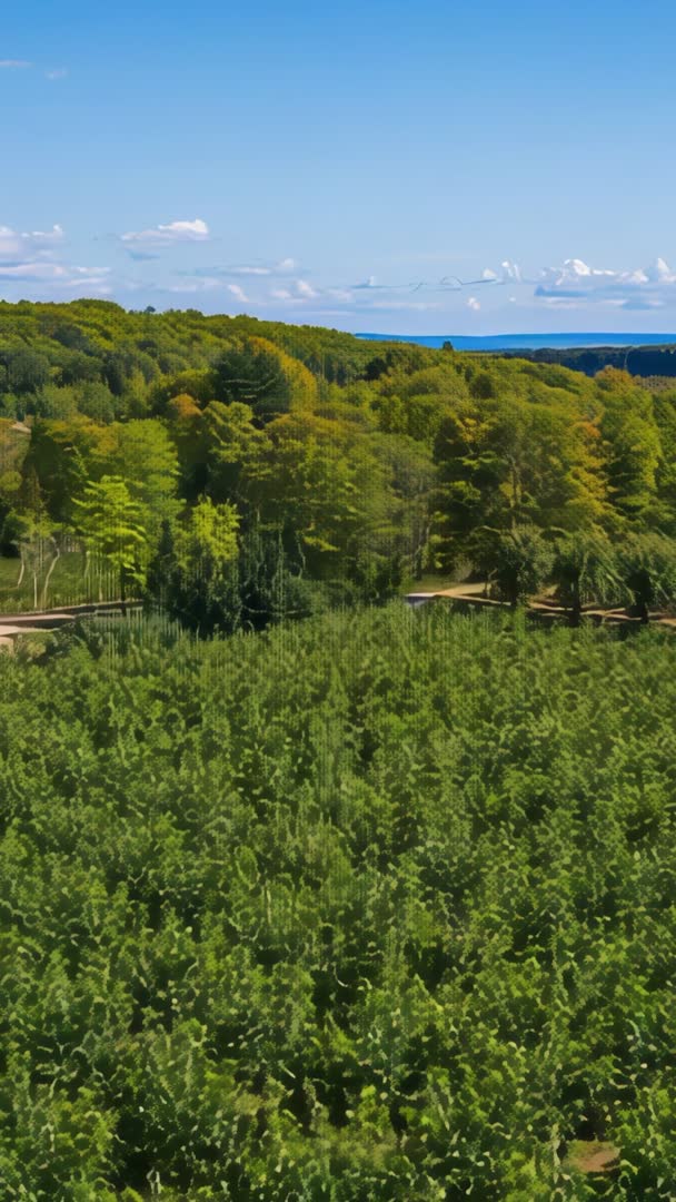 AI Generated Image. Vertical drone footage showing dense green crop rows transitioning into mixed woodland with distant water on horizon. Camera moving slowly downward, revealing texture of fields, dirt path cutting through tree line, and layered landscape. Serving as b-roll in agriculture, forestry, environmental and travel videos, or functioning as mobile-first vertical background for social media ads. Useful for promoting sustainable farming, land management, rural tourism, and conservation projects. Stock-friendly composition leaving room for titles and lower-third graphics in upper frame. Working well for documentary openers, real estate land listings, seasonal change stories, and aerial survey overlays. Delivering calm natural color palette and crisp vertical framing optimized for smartphone playback.