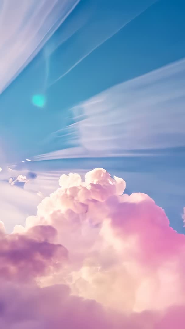 AI Generated Video. Showing vertical pan across sunlit pastel cumulus clouds with soft lavender and pink tones, cyan sky, jet contrail, and lens flare. Capturing gentle motion and airy depth for cinematic mobile backgrounds and social reels. Featuring vertical 9:16 aspect ratio, optimized for mobile screens and portrait displays. Delivering loop-friendly composition with clear upper space for overlay text, logos, captions. Suggesting uses: meditation apps, wellness promos, travel videos, fashion reels, mobile wallpapers, title sequences. Color grading suggestions: enhance pastel pinks, retain cyan highlights, add gentle glow to flare for dreamy atmosphere. Providing calming, uplifting mood for brand intros, social ads, ambient visuals, event openers.
