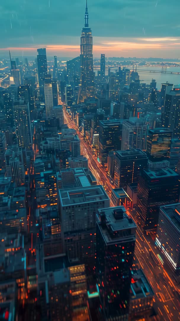 AI Generated Image. Vertical aerial video pushing forward over downtown skyline, revealing spire-topped tower and glowing avenue lights at dusk. Cityscape framing moody teal sky and warm orange street lights, creating cinematic contrast and strong leading lines toward spire. Vertical orientation optimized for mobile platforms, reels, stories and vertical ads. Suiting opening sequences, serving as establishing B-roll for travel, architecture or real estate projects, supporting tech and finance promos, and delivering atmospheric background for title overlays or looped website hero. Color grading featuring teal-orange contrast, motion blur on traffic flows, subtle rain streaks and deep urban shadows. Shot in vertical 9:16 with cinematic push-in movement, compatible with 4K delivery and short-form content workflows.