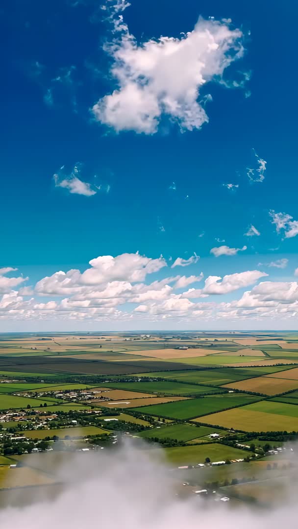 AI Generated Image. Showing rising aerial reveal over farmland with cumulus cloud drifting and low fog thinning across patchwork crop fields and distant horizon. Offering calm, expansive rural mood and strong vertical composition well suited for smartphone storytelling and social media reels. Ideal for travel commercial openers, weather forecast graphics, agricultural and farm management promos, wellness and mindfulness clips, app splash screens, cinematic title intros, and broadcast sequences. Suggesting color grade with boosted teal sky, enhanced cloud contrast, and preserved soft fog highlights. Delivering as 9:16 vertical 4K for mobile and broadcast use. Licensing ideas include hero visual for landing pages, background loop for presentations, seasonal marketing campaigns, and nature documentary sequences.