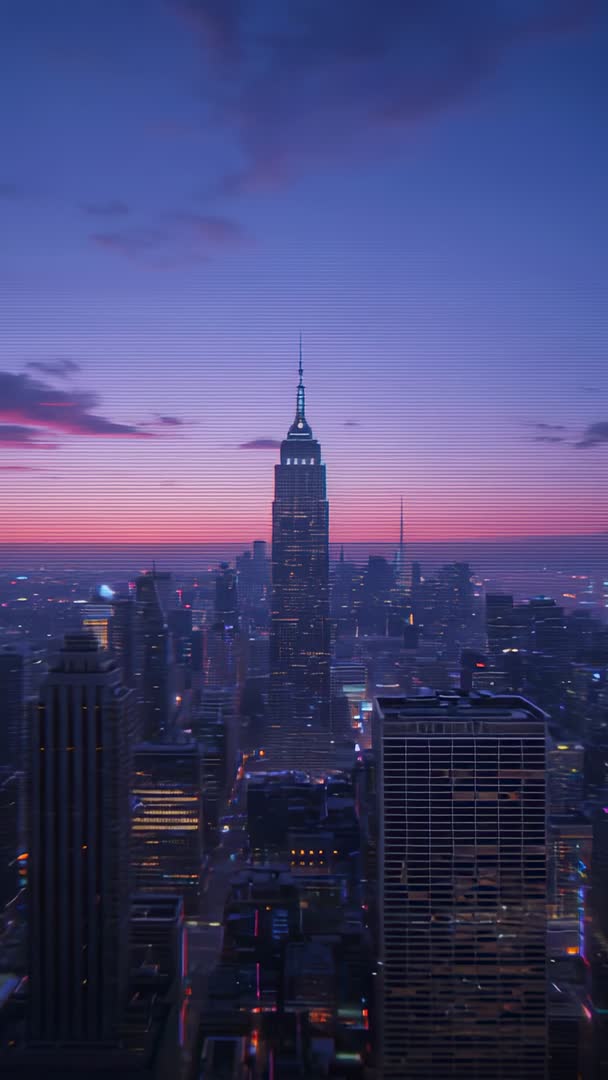 AI Generated Image. Vertical aerial video capturing Empire State Building towering above Midtown during vibrant dusk light, with city lights glowing and sky shifting from pink to deep blue. Foreground skyscrapers creating depth while streets displaying grid of illuminated lines and moving traffic. Serving travel promos, urban lifestyle reels, broadcast openers, website headers, social media stories, and real estate marketing. Editing suggestions: adding gentle color grade to enhance magenta and indigo tones, overlaying bold sans-serif headline text, pairing with ambient synth soundtrack for cinematic mood. Vertical format optimized for mobile and social platforms, delivering immersive tall-screen viewing experience. Supporting documentary sequences, corporate city profiles, brand storytelling, tourism campaigns, and inspirational montages.