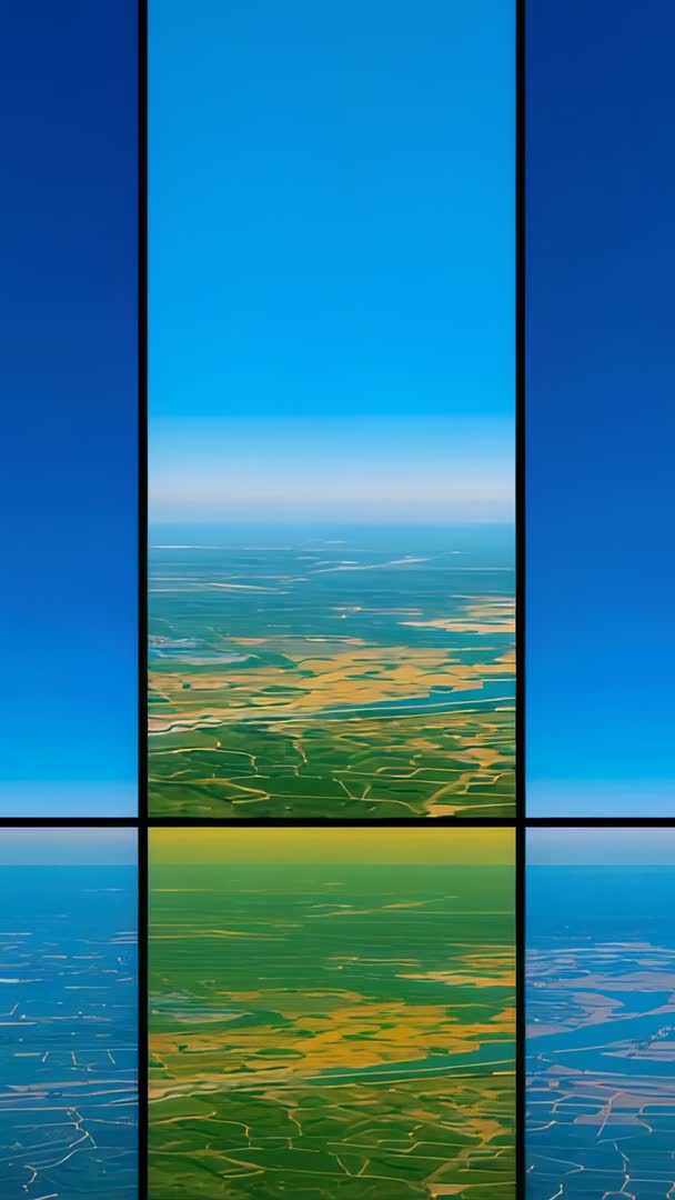 AI Generated Video. Vertical 9:16 aerial video showing patchwork farmland and meandering river through tall mullioned window panels. Black mullions forming grid and revealing layered panes with mirrored lower reflection, creating striking vertical composition. Vibrant blue sky meeting distant horizon and green-gold field geometry providing strong color contrast and visual rhythm. Useful for mobile-first content such as social media reels, story ads, and vertical hero backgrounds. Suitable for agriculture and environmental storytelling, travel and destination promos, architectural intros, corporate presentations, and broadcast bumpers. Easy to customize with text overlays, animated captions, parallax edits, color grading, or looping for continuous background use.