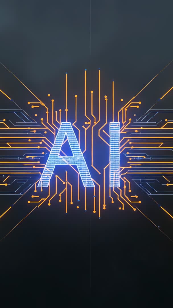 AI Generated Image. Featuring glowing orange-blue circuitry forming letters AI, pulsing lines and electronic nodes radiating outward and converging into high-tech pathways. Animation style combining neon outlines with vector traces, creating strong sense of data flow, connectivity, and intelligent systems. Vertical format optimized for mobile portrait displays and social platforms, offering cinematic central focal point with dark negative space for overlays. Ideal for tech product launches, AI conference openers, app intros, cybersecurity promos, corporate presentations, startup pitch decks, social media reels, vertical ads, and website hero loops. Suggested uses include placing headline or branding in upper or lower third, leaving negative space below for text and call-to-action, enabling seamless loop for background playback, and applying color grading or speed ramping to match brand tone.