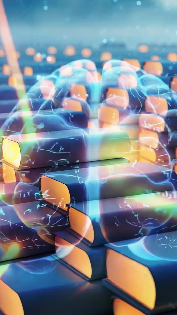 AI Generated Image. Vertical video showing holographic neural-network brain forming above stacked books on illuminated grid. Brain pulsing with electric currents and floating mathematical formulas, evoking fusion of knowledge and artificial intelligence. Color palette using neon blue and warm orange for high-contrast futuristic mood. Composition emphasizing depth and motion for engaging vertical-screen viewing. Ideal uses: tech presentation openers, AI research promos, e-learning intros, library or publishing brand spots, social media vertical ads, event trailers. Editing suggestions: pair with ambient electronic soundtrack, add headline text overlays, animate formula layers for data-driven narrative. Format recommendations: optimized for mobile vertical platforms such as Instagram Stories, TikTok, Reels, and in-app demos.