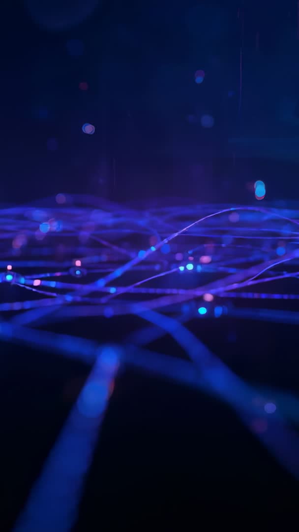 AI Generated Image. Vertical animated loop showing digital network of glowing filaments swaying at low angle, with orbs pulsing and dust-like particles drifting through deep blue and purple space. High-contrast glow and shallow depth of field creating cinematic sense of depth and motion. Perfect for technology intros, app splash screens, social media vertical ads, music visualizers, broadcast overlays, event backdrops, product launch teasers. Easy to loop and color grade, working well with overlay text and logos placed in upper negative space. Offering flexible loop length and slow-motion friendly motion for calming ambient backgrounds or high-energy promo edits.