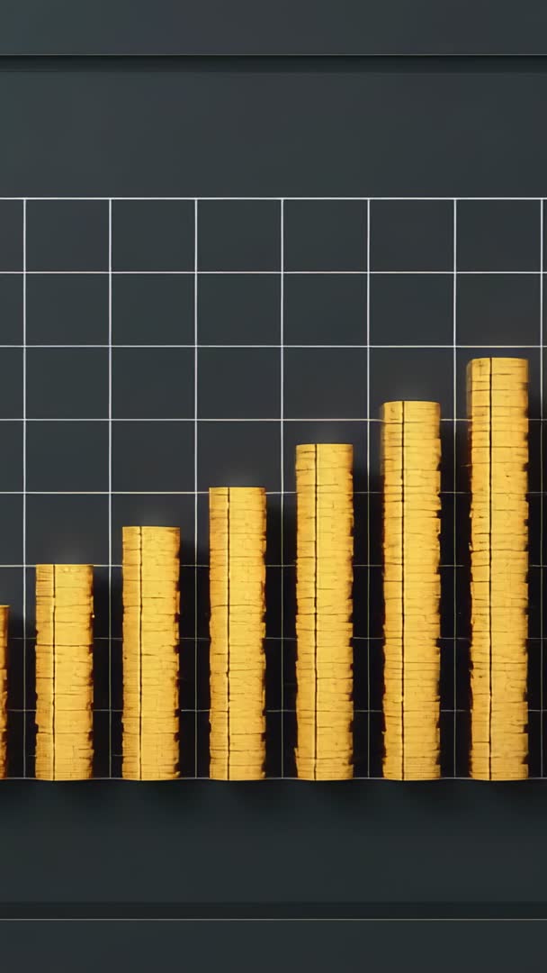 AI Generated Video. Showing vertical looping video featuring stacks of gold coins rising on dark shelf while grid lines form ascending bar chart. Stacks stacking smoothly into taller columns, illustrating revenue increase, investment return, and wealth accumulation with minimalist composition. Ideal for use in mobile ad, social media reel, app intro, investor pitch, financial explainer, corporate presentation opener, or website hero. Suggesting placement of short headline on upper third, numeric stat or KPI overlay near center, and logo or CTA near lower center for clear conversion. Recommending subtle sound design such as soft chimes or ambient synth pad and upbeat corporate music for energy. Optimized for vertical 9:16 aspect ratio, high-resolution 1080x1920, loop-friendly for continuous playback, and color grading to emphasize gold tones against dark background.