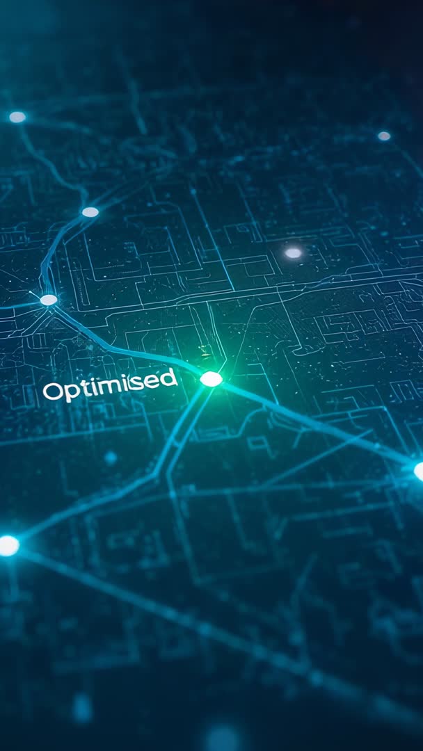 - Vertical animation showing pulsing network node sending optimised signal across teal circuit map