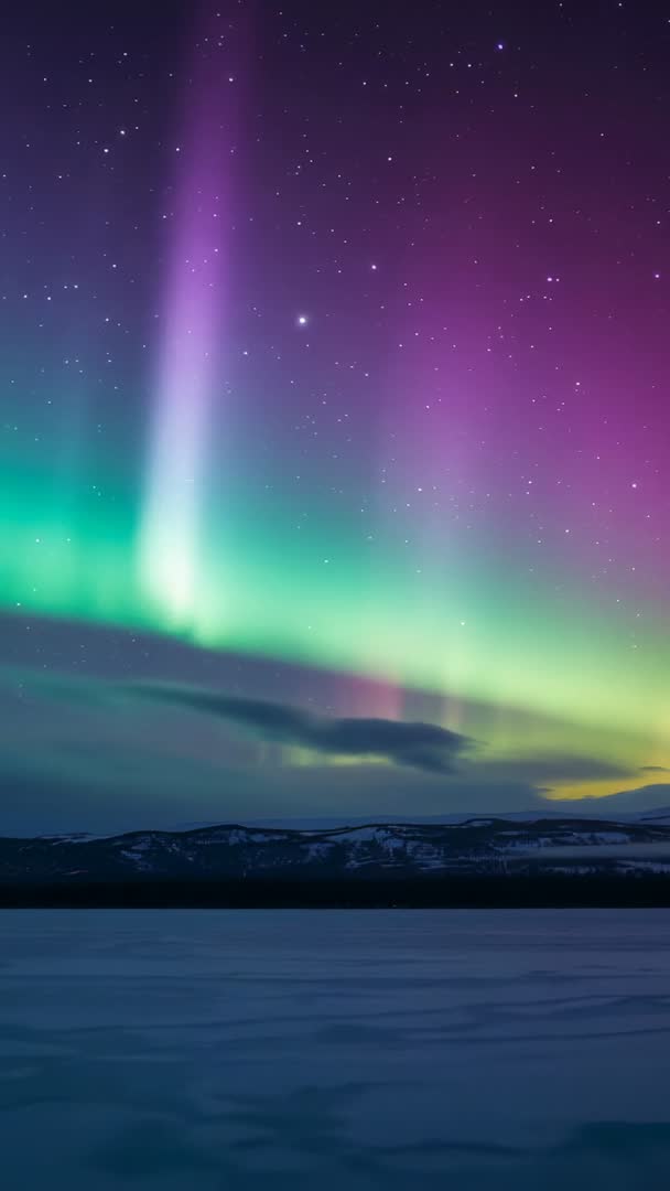 AI Generated Video. Showing vertical video of northern lights shifting from emerald green band into towering purple pillar after solar pulse, rising above frozen lake and distant mountain horizon under starry sky. Foreground featuring snow-covered ice with soft reflections, midground revealing dark mountain ridge, background filled with glittering stars and layered aurora curtains. Colors ranging from emerald green to violet and magenta, creating dramatic contrast for cinematic and mobile use. Suiting mobile vertical backgrounds, social media stories, Instagram reels, TikTok clips, travel and adventure channels, weather and space documentaries, educational content about space weather, meditation and relaxation visuals, and arctic tourism promotion. Leaving ample dark area in lower third for headline or logo and working well as looped background, cinematic opener, smartphone wallpaper, vertical ad, or hero banner. Conveying sense of wonder, solitude, and cosmic energy for branding, editorial, or cinematic projects.
