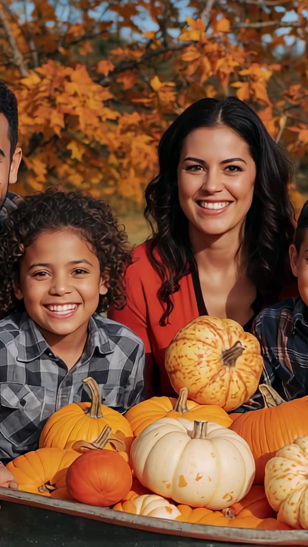 AI Generated Video. Vertical video showing gentle camera pan across family posing at pumpkin patch with pumpkins and colorful autumn leaves background. Mother and children smiling and holding pumpkins, creating warm seasonal mood and authentic family connection. Serving as ideal content for seasonal marketing, pumpkin patch promotions, harvest festival ads, Thanksgiving and Halloween campaigns, family lifestyle reels, mobile-friendly hero banners, greeting cards, blog headers, and TV commercials. Footage working well for brand storytelling, seasonal menu promotions, fall event invitations, and educational content about harvest activities. Color palette highlighting warm orange and gold tones, suitable for overlays, text callouts, and lower-third transitions. Recommending slow-paced music, soft warm color grade, and vertical crop for social media platforms and mobile ads.