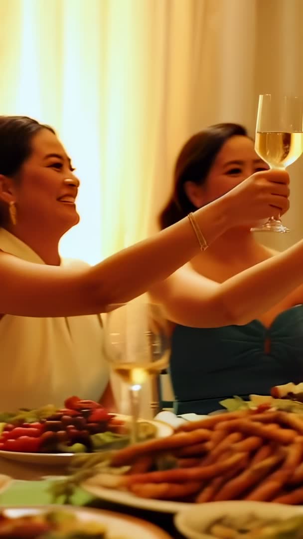 AI Generated Video. Vertical video showing guests raising wine glasses and clinking in warm candlelit banquet moment. Smiling guests wearing eveningwear and reaching across table filled with appetizers, fruit and pretzels, creating festive and elegant atmosphere. Suited for corporate event promotion, restaurant and hotel marketing, wine and champagne advertising, social media vertical ads, wedding and holiday content, lifestyle and hospitality websites. Offering close up shots for editing into hero sequence, intro clip, looped background for story ads, event recap reels, or celebratory greeting content.