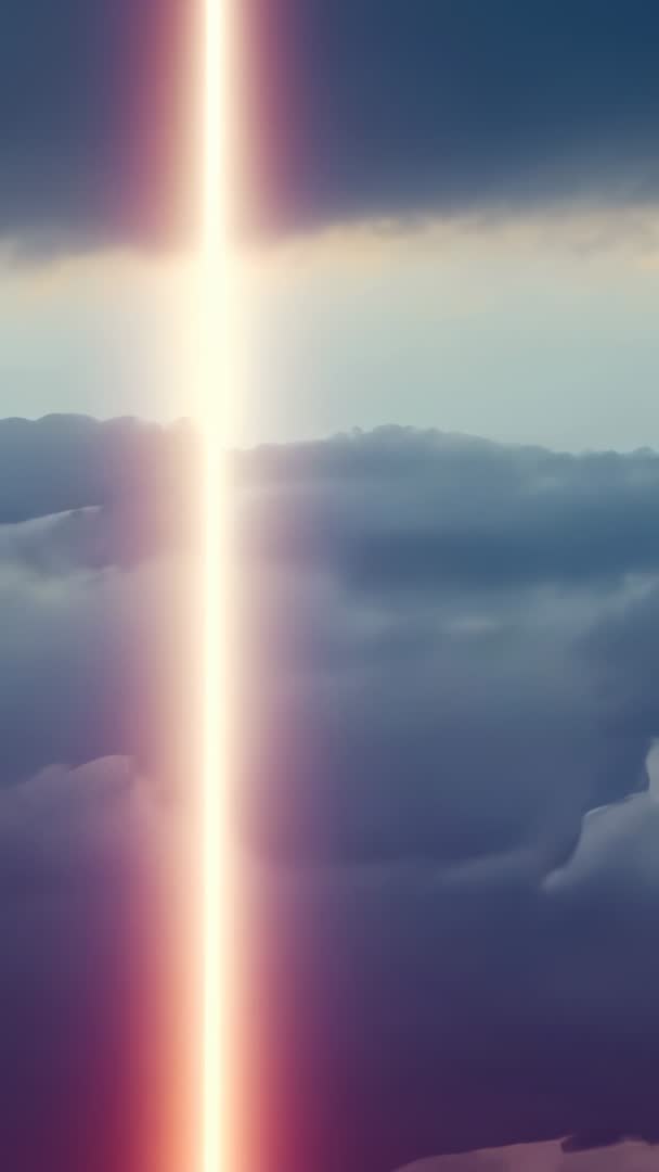 AI Generated Image. Vertical video showing narrow beam of light elongating into powerful column and cutting through layers of clouds, creating dramatic glow and atmospheric haze. Visual working well for sci-fi openers, spiritual themes, meditation and mindfulness content, mobile wallpapers, social media vertical ads, cinematic intros. Composition offering strong central focus and ample negative space for overlay text or logo placement. Color palette combining warm core glow with cool cloud tones, enabling seamless color grading and integration with motion graphics. Looping capability supporting continuous background loops for live visuals, VJ sets, weather forecasts, promotional reels. Exporting in portrait aspect ratios recommending use for mobile storytelling and vertical video platforms.