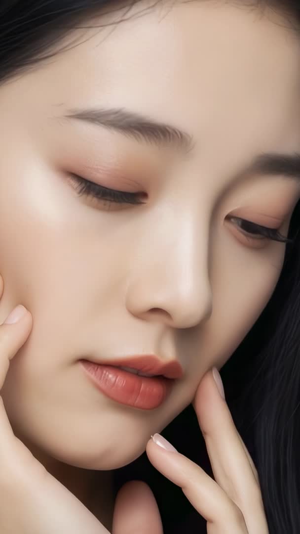 AI Generated Image. Capturing closeup vertical portrait opening with head lift and gentle jaw tracing by hand. Showcasing flawless skin, soft matte eyeshadow, natural lip tone, and long lashes for refined beauty look. Featuring elegant manicure and tender facial expression conveying calm and introspection. Filming in studio with soft directional lighting and shallow depth of field for cinematic beauty mood. Ideal for beauty campaigns, makeup tutorials, skincare commercials, product launch teasers, social media reels and mobile ad spots. Suggesting edit approaches: adding slow dissolve, subtle color grading, ambient music bed, and text overlays for product messaging. Suitable for website hero banners, Instagram Reels, TikTok videos, e-commerce thumbnails, editorial beauty features, and brand storytelling.