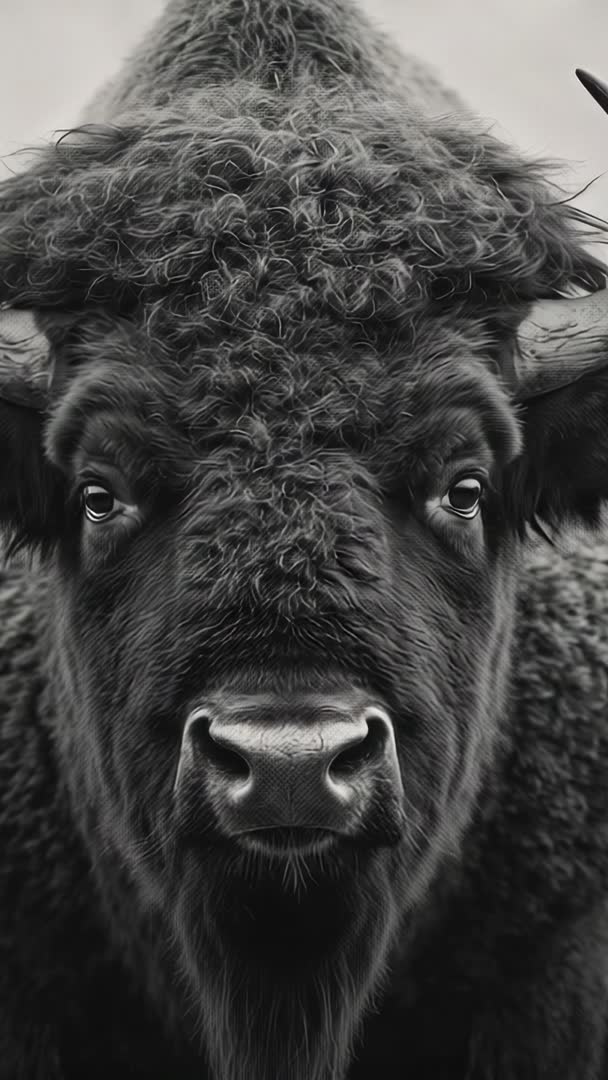 AI Generated Video. Capturing vertical closeup of bison head staring into lens, breathing slowly, showing dense curly forehead fur and short horns. Overcast light creating moody tones and strong texture on fur and muzzle. Background suggesting open grassland with shallow depth of field and natural movement of breathing. Useful for wildlife documentary sequences, social media vertical reels and stories, conservation and environmental campaigns, educational clips, and cinematic nature reels. Footage working well as opener for nature films, background for title cards and lower-thirds, dramatic cutaway for ranch or national park storytelling, or emotive stock clip for editorial and commercial projects.