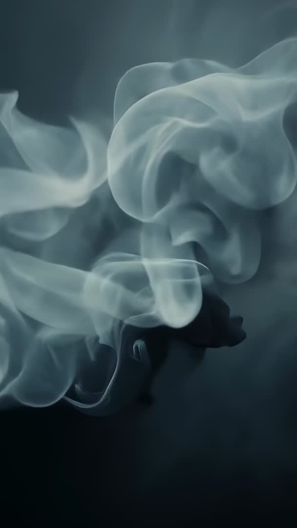 AI Generated Video. Vertical video capturing blue-gray smoke rising, unfurling and drifting through dark studio with soft rimlight and layered plumes. Offering cinematic, moody backdrop for music videos, title sequences, product spots, fashion reels, and social media vertical ads. Allowing looping for continuous motion, color grading for brand matching, and opacity masking for text or logo overlays. Working well for atmospheric transitions, mystery or noir storytelling, abstract art pieces, and wellness or meditation content. Emphasizing delicate tendril detail and smooth flow for close-up or full-screen compositions.