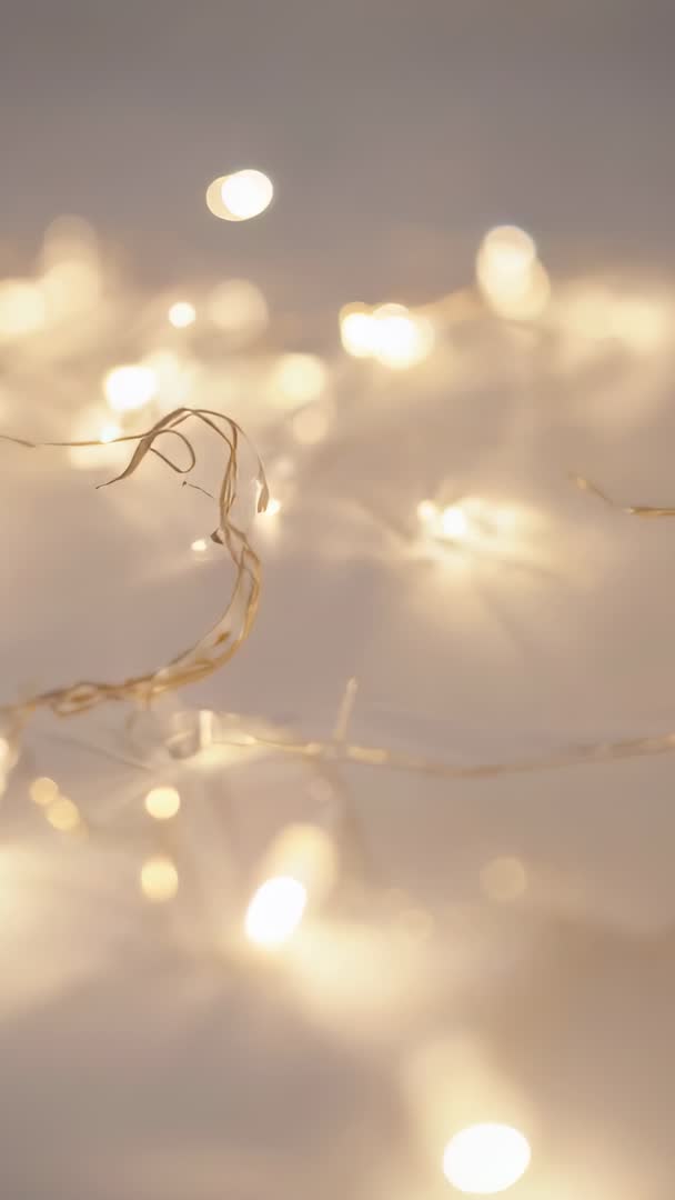 AI Generated Video. Vertical cinematic clip showing warm LED fairy lights on copper wire, racking focus to create shallow depth of field and creamy bokeh. Closeup macro movement creating cozy, romantic mood with soft ambient glow. Ideal for social media vertical formats, Instagram Stories, TikTok backgrounds, mobile wallpapers, and website hero sections. Working well for holiday campaigns, wedding slideshows, product intros, mood videos, and backdrop for text or logo overlays. Making clip loop-friendly for slow-motion editing, supporting smooth transitions and warm color grading. Suggested uses: overlaying short promotional copy, adding soft ambient music, using as background for countdowns or product reveals.