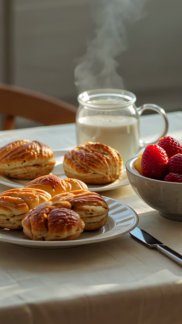 AI Generated Video. Vertical clip capturing steaming milk pitcher on breakfast table, camera shifting across golden pastries and bowl of ripe strawberries. Soft morning light bathing flaky crust, steam rising in gentle trails, shallow depth creating creamy bokeh behind subject. Scenes working well for food blog intro, cafe menu promo, social media reels, recipe tutorial, hotel or bakery advertising. Editing suggestions include warm color grade, gentle acoustic music, optional slow motion segment for emphasizing steam, loopable cut for background use. Composition details include plates of round buns, ceramic bowl with berries, stainless knife on tablecloth, clear glass pitcher with handle, natural textures creating cozy, inviting mood.