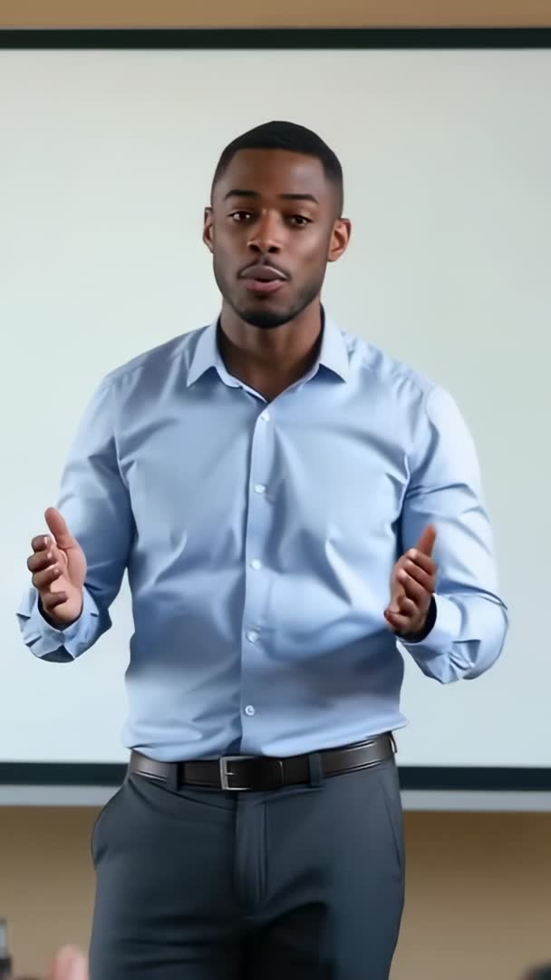 AI Generated Image. Presenting confident presenter explaining topic in front of projection screen, using open-hand gestures and direct eye contact. Supporting corporate training, leadership workshops, sales pitches, investor updates, internal communications, and online course modules. Fitting vertical social media reels, mobile e-learning, LinkedIn posts, conference highlight clips. Enabling easy editing for brand messaging, speaker demo reels, marketing campaigns. Including practical tips: add lower-third title, include subtitles for accessibility, crop for mobile framing, adjust color grading for brand consistency.