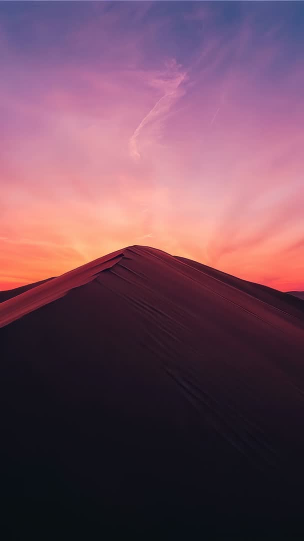 AI Generated Image. Vertical video showing camera moving along dune ridge at twilight, capturing warm gradient sky and textured sand ripples along crest and horizon. Serving as dramatic background for mobile wallpaper, social media reels, travel and tourism promos, meditation and relaxation apps, website hero banners, cinematic openers, environmental storytelling. Featuring strong silhouette and high contrast between shadowed sand and colorful sky, perfect for overlaying bold typography and brand messaging. Featuring slow tracking motion and vertical framing, allowing seamless use in Instagram Reels, TikTok, Snapchat and mobile ads. Color grading highlighting magenta and orange tones, creating serene yet dramatic mood. Ideal for editors seeking loopable clip for background, short opener for documentary or travel film, or hero visual for adventure and nature campaigns.