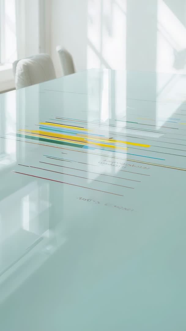 AI Generated Video. Showing vertical camera pan across glossy office table featuring colorful bar chart lines and strong window reflections. Soft daylight filtering through panes, creating bright, airy mood. Minimalist modern interior with soft upholstered chair visible in background, offering professional, calm atmosphere. Working well for vertical social ads, mobile app backgrounds, corporate presentation openers, and data-driven explainer sequences. Pairing easily with motion graphics, title overlays, or lower-third animations for analytics, finance, or market research topics. Safe cropping for portrait-oriented reels, stories, and product pages. Editing tips: apply gentle speed ramping, subtle color grade to enhance pastel teal and yellow accents, and add light parallax for depth. Licensing suitable for commercial use in websites, promos, onboarding videos, and broadcast bumpers.