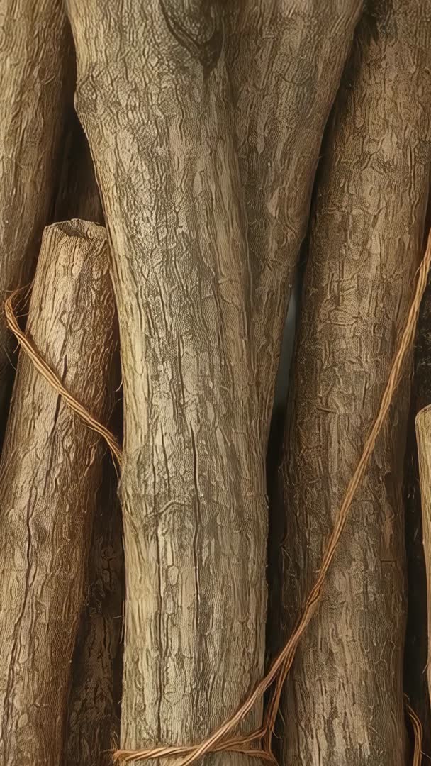 AI Generated Video. Showing tactile close-up of stacked tree trunks bound with twine, vertical video capturing rich bark texture and warm brown tones. Camera slowly panning upward, revealing knots, rope crossings, and layered timber forms. Working well for backgrounds in social media reels, vertical ads, woodworking tutorials, rustic branding, and interior decor promos. Pairing with soft acoustic music or ambient forest sounds, looping seamlessly for continuous backgrounds or cutting into textured transition shots for titles and product reveals. Providing high-resolution texture for packaging mockups, print patterns, website hero sections, mood boards, craft blogs, and ecommerce listings.